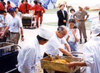 | 中華街の料理人の方々より、揚げなべを使用した ”焼きそば”と ”焼きビーフン” が提供される |
