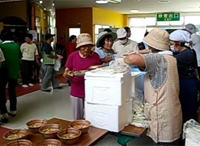 | 効率良く配食するために、1食ずつ弁当容器に分けていく | スムーズに配食されている様子 | |